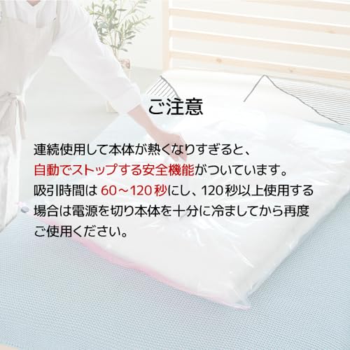 仕様上は消費電力約270Wで、家庭用小型モーターとしては中程度の出力です。実際にシングル布団・掛け布団で圧縮を行ったところ、付属のアダプタ+一般的なバルブ式圧縮袋では空気排出完了までにおおむね60〜90秒/袋(サイズや素材に依存)。これは家庭用掃除機の排気吸引と比較するとやや遅い場面もありますが、掃除機を用意・接続する手間と比較すれば時短効果があります。吸引の連続運転時に若干温度上昇を感じたため、長時間連続運転(業務利用)は推奨できません。