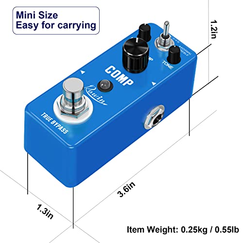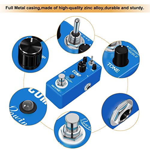 Rowin LEF-333は、クラシックなスタジオグレードのアナログ回路を“ミニサイズ”に凝縮したギター用コンプレッサーです。内部は光学式(オプト)またはFET風の回路設計を模した簡易アナログトポロジーで、入力のピークを滑らかに抑え、サステインを伸ばすことを目的としています。物理的には亜鉛合金の筐体とトゥルーバイパスを採用し、ペダルボード運用を前提とした堅牢性と信号純度の維持を両立させています。