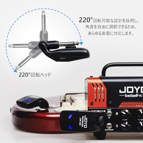 JOYO JW-03は、6.35mmプラグ対応のギター/ベース向け2.4GHzワイヤレスシステムです。トランスミッター(送信機)とレシーバー(受信機)を含み、最大伝送距離20m、内蔵バッテリーで8時間以上の連続駆動を売りにしています。技術的には2.4GHz帯のデジタル伝送を採用し、メーカー公称で5ms未満の低レイテンシー・低ノイズ伝送を実現。プラグが220度回転する機構は、ストラップピン周りや狭いエフェクターボード上での取り回しを容易にします。