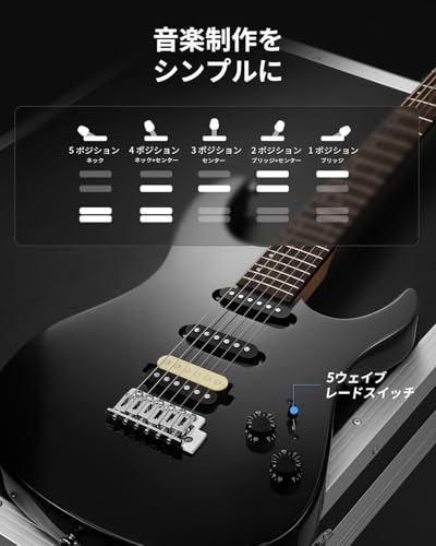 メリット:低価格でSSHの音色バリエーションを手に入れられる点、薄型Cネックの演奏性、ポプラ材による扱いやすさ、付属の専用ケースで保管や持ち運びが楽、DMTピックアップによる幅広いジャンル適応。初心者が最初の1本として演奏とサウンドの両方を学びやすい設計です。