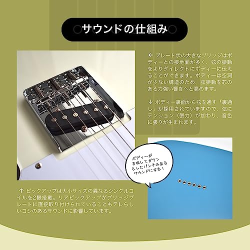 ボディ材・ネックの材組み合わせ、ナット幅やフレット処理は演奏性に直結します。TL-17は伝統的なテレキャスターの輪郭を踏襲しつつ、ピックアップの出力は中庸にセッティングされており、弦のアタック音が前に出る設計です。これによりミックス内での存在感が出やすく、録音用途でも使いやすい傾向があります。専門的には、弦振動の伝達効率を高めるブリッジ剛性とサドル材の影響で高域の粒立ちが良く聞こえます。