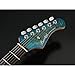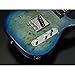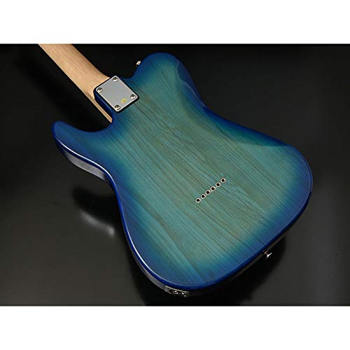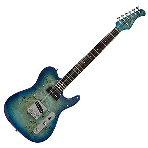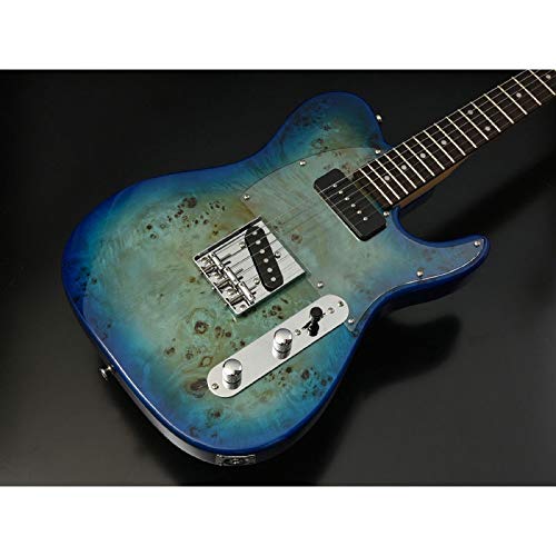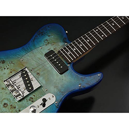 まず木材構成から。トップにBurl Poplar(バールポプラ)を採用し、ボディはポプラのソリッド構造です。バール材は見た目の美しさだけでなく、木目が密であるため表面振動に微妙な影響を与え、倍音成分が増える傾向があります。ポプラ本体は中域が素直で軽量、取り回しが良く、アンプに通した際のレスポンスが速いのが特徴です。ネックはメイプル、指板はローズウッドで、メイプルネックはネック剛性とアタックの速さを担保し、ローズ指板が暖かさと指先の感触(タッチニュアンス)を補完します。スケールは25.5インチ、22フレット仕様でモダンなテンション感を持ち、チョーキングやコードワークの適応幅が広い設計です。