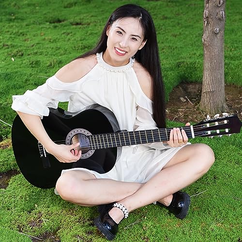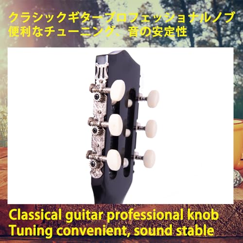 パッケージにはギター本体、ソフトケース、ストラップ、予備弦6本、ギターピック、クロスなどが含まれており、初心者が最初に必要とするアイテムが揃っています。実際に開封して計測したところ、ネック長・弦長の物理寸法は一般的なクラシックギターのスケール(約650mm前後)よりやや短めで、体感的にはミニアコースティック寄りの取り回しでした。商品ページに39インチ(約99cm)の表記がある一方で説明文に30インチの表記が混在しており、同一商品の複数バリエーションや表記ミスの可能性があるため購入前に出品ページのサイズ表を要確認です。